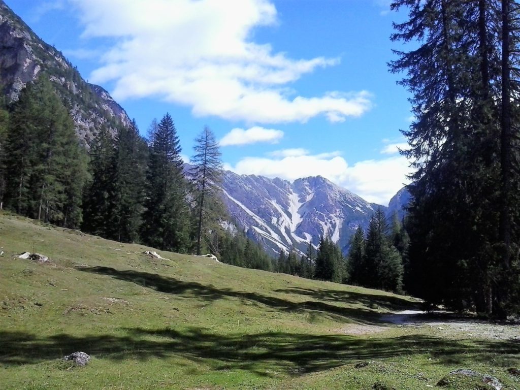 Percorro il lato ovest del lago (1494 m.) passando davanti alla piccola cappella, in breve raggiungo una spiaggia di ciottoli bianchi dove giro a destra seguendo il segnavia CAI 19 che entra nella Val Foresta e raggiungo in circa un ora la Grunwald Alm (1590 m, posto di ristoro).
